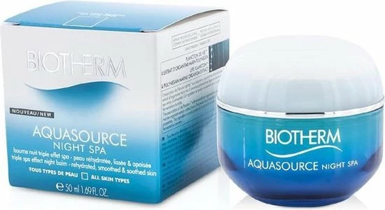 Aquasource Night Spa van Biotherm is een hydraterende nachtcr?me, die tevens als een gezichtsmasker gebruikt kan worden. Door de intense hydratatie die de cr?me ?s nachts geeft vervagen fijne lijntjes, oogt de huid voller en straalt deze. Voor een hydratatieboost, kan de creme ook overdag gebruikt worden als gezichtsmasker. Breng de cr?me aan en laat deze 5 minuten intrekken. Voor een veerkrachtige, stralende en gehydrateerde huid.