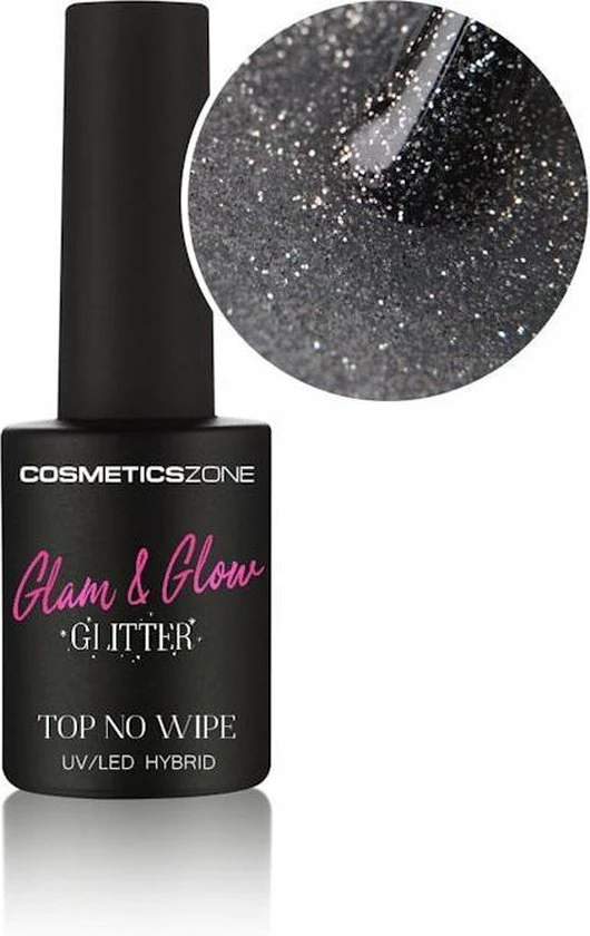 Werk je UV/LED gellak nagels af met een zilveren glitter topcoat en verander elke gellakkleur in een glinsterende lak met ultieme bescherming. Een hybride topcoat voor de perfecte afwerking van jouw UV/LED gelnagels met sprankelende, zilveren deeltjes. Een perfecte oplossing om je gewone hybride lak te veranderen in een glitterlak! Het duurt maar een paar minuten om glans aan elke styling toe te voegen. De Cosmetics Zone Glam en Glow topcoat zit vol met zilveren glitterdeeltjes. Het is een product dat je manicure beschermt, maar ook extra glans geeft. De glittertopcoat is de perfecte oplossing voor elegante hybride nagels. Uithardingstijd: UV-lamp: 120 seconde, LED-lamp: 30 seconde. Gebruiksaanwijzing: Stap 1: volg de gebruiksaanwijzing van de gellak kleur, Stap 2: werk de nagels af met de Top Coat zilveren glitters en hard deze laag uit in je nagellamp. De nagels hoeven niet schoongemaakt te worden met een cleaner. Het is een No Wipe topcoat. Inhoud: 15ml.