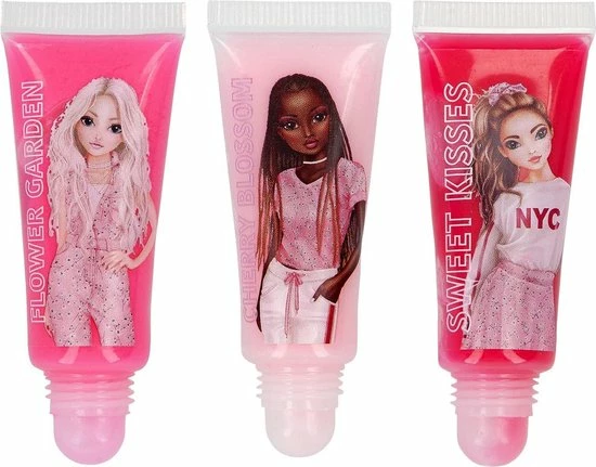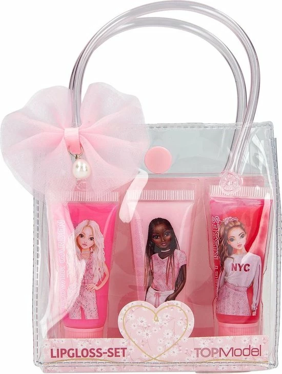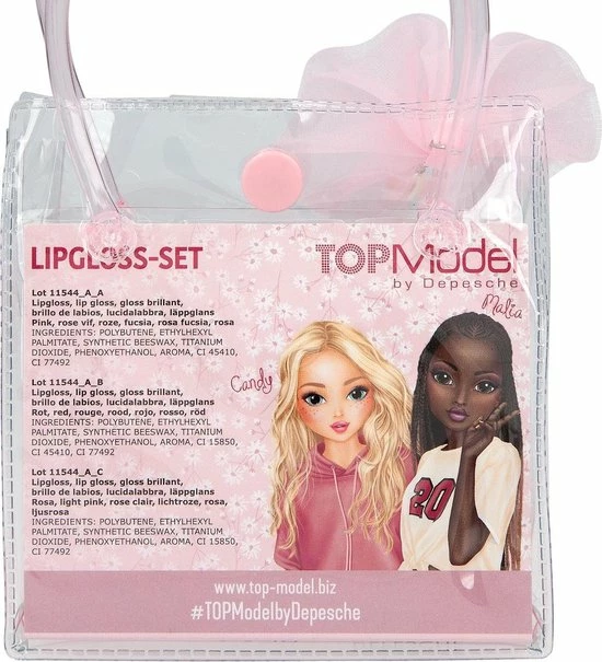Een tasje vol met prachtige lipgloss: 3 tubes met elk een inhoud van 9 ml van schitterende lipgloss in de geuren blauwe bessen, appel en cola. Met een handvat, een strik en heel veel stijl van TOPModel.
