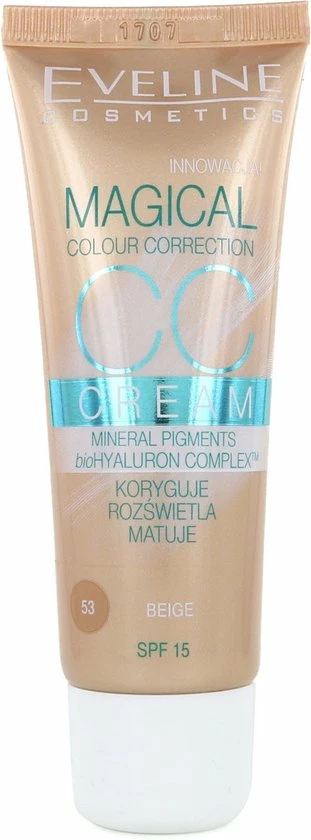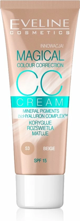 Egaliseer eenvoudig je teint met de Eveline Cosmetics Cc Cream Magical Colour Correction Natural. De Magical Colour Correction formule verandert de crème direct na het aanbrengen in een licht matte vloeistof, waardoor de huid egaal en natuurlijk van kleur wordt. De micro-ingekapselde natuurlijke minerale pigmenten komen geleidelijk vrij en corrigeren de gehele dag de teint van je huid. De CC-Cream bevat geconcentreerd hyaluronzuur met hydraterende en gladmakende eigenschappen. De teint ziet er natuurlijk, onberispelijk en stralend uit. SPF 15 beschermt tegen UVA/UVB.
