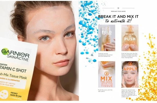 Ontdek de eerste Fresh Mix Tissue Maskers van Garnier! Verwen je huid met een hydraterende boost vitamine C. Vitamine C revitaliseert en laat de huid stralen. Mix zelf het tissuemasker met de lotion voor een verfrissend en effici?nt masker. Een vitamine C serum wordt pas geactiveerd tijdens het mixen, voor een optimale werking van het masker. Ervaar de frisse sensatie van Garnier’s meest intense maskerverzorging.