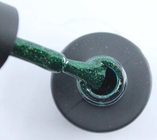 Deze donkergroene gellak heeft een subtiele glitter in zich.
