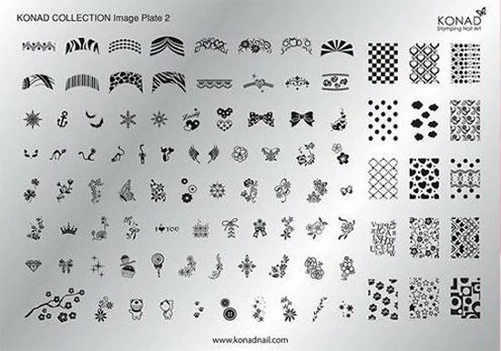 KONAD Collection stempel sjabloon GROOT 2 / Konad Collection image plate 2, cre?er de perfecte stempel nail art met superieure precisie en detail! Op deze grote stempel sjabloon van Konad heeft u alle verschillende designs binnen handbereik, nagel stempelen is nog nooit zo makkelijk geweest!