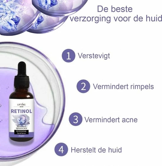 Retinol heeft een verjongende werking op de huid, heeft een licht exfoli?rende werking tot in de diepere huidlagen en zorgt voor een boost in de celvernieuwing. Kan pigmentvlekjes, fijne rimpeltjes en lijntjes bestrijden en helpen te voorkomen. Maakt de huid gladder, egaler en zachter en kan littekens van bijvoorbeeld acne en huidbeschadiging door onder andere zonschade herstellen.